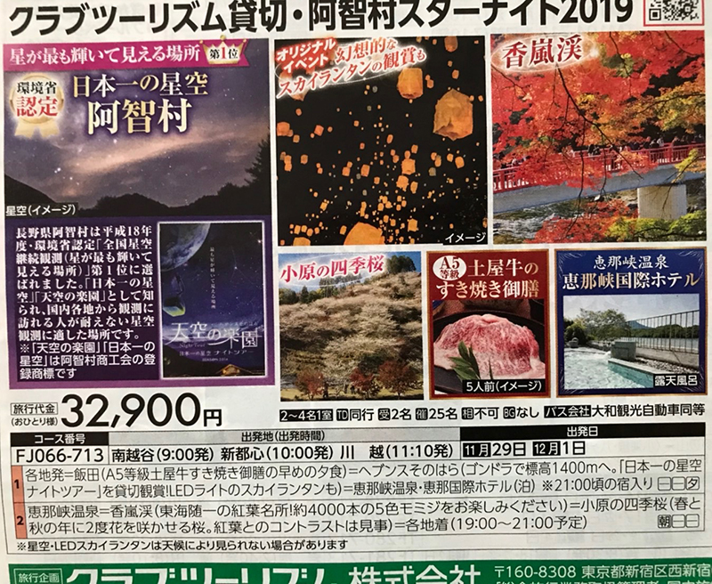 FJ066:『[恵那峡温泉宿泊プラン]「日本一の星空ナイトツアー」幻想的なスカイランタン!クラブツーリズム貸切「阿智村スターナイト」2日間』【南越谷・新都心・川越出発】