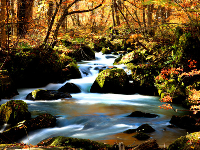 湯瀬温泉(8:00発)==○奥入瀬渓流(心洗われる美しいせせらぎ・約40分)==