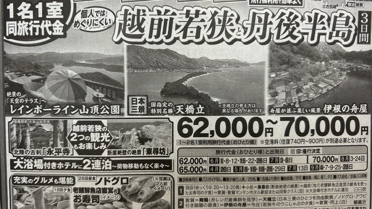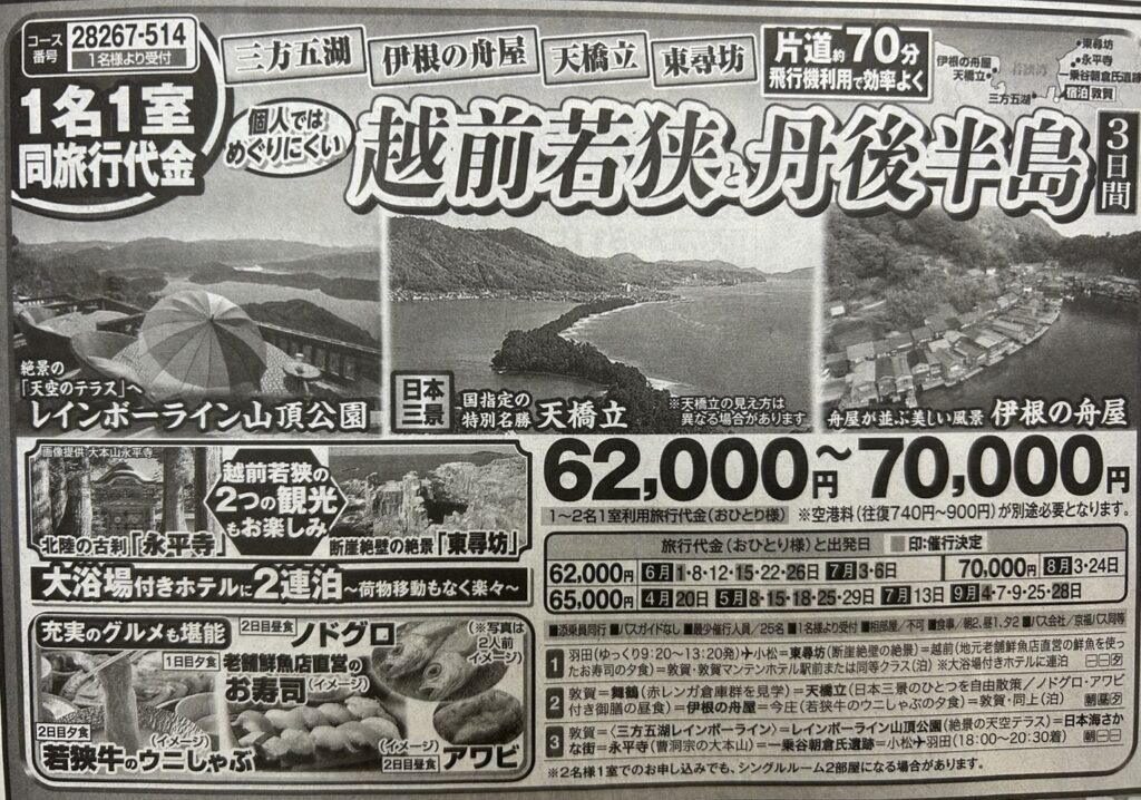 【2025年4月出発からはこちら】『天橋立・伊根の舟屋・東尋坊・三方五湖 個人では巡りにくい越前若狭・丹後半島 3日間』<1名1室同旅行代金>