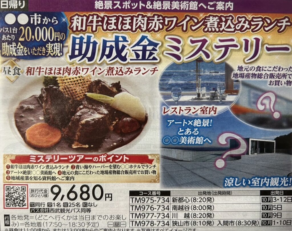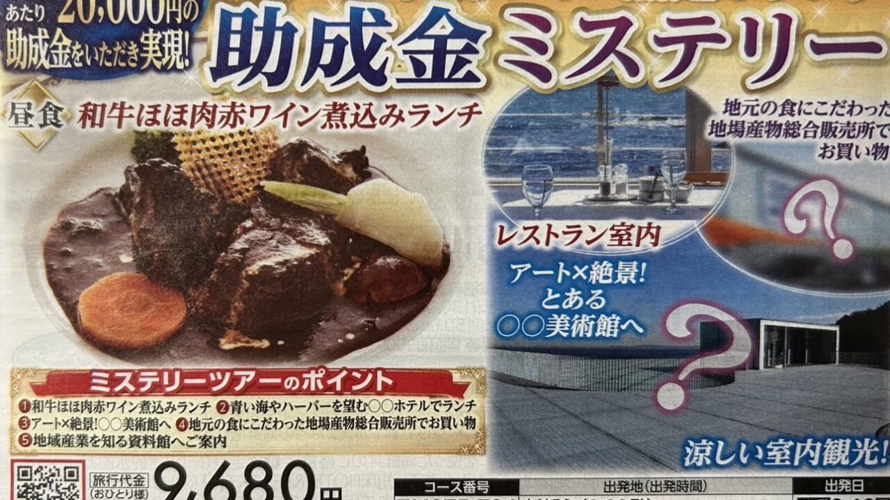 『海沿いホテルで和牛ほほ肉赤ワイン煮込みランチ 助成金ミステリー』【南越谷 出発】