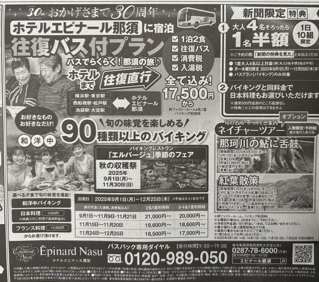 東北道那須IC10分。那須塩原駅送迎バス有。日光東照宮/日光江戸村/鬼怒川東武ワールドスクウェア/会津90分