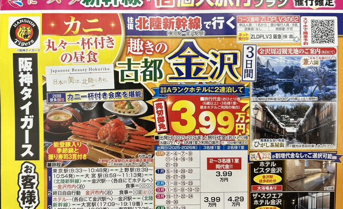 【カニ丸々一杯付き会席のお食事付き!】往復北陸新幹線行く!趣きの古都・金沢 3日間