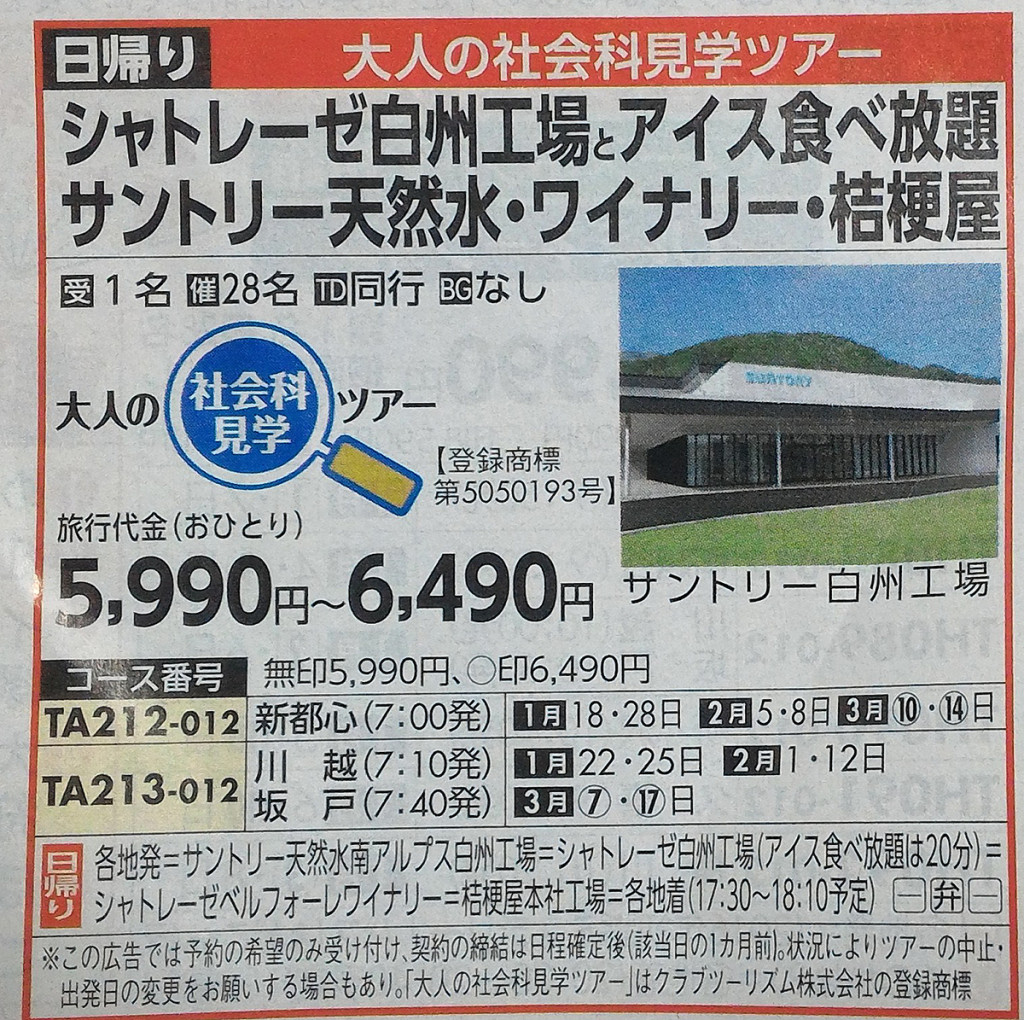 TA212-012:『シャトレーゼ白州工場とアイス食べ放題 サントリー天然水・ワイナリー・桔梗屋』 【新都心 出発】