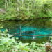 〈3〉別府弁天池・・・カルスト地帯特有の湧水で摂氏14度と冷たく、コバルトブルーに染まった神秘と伝説の湧水池。清冷な水は、日本名水百選に選定されています。