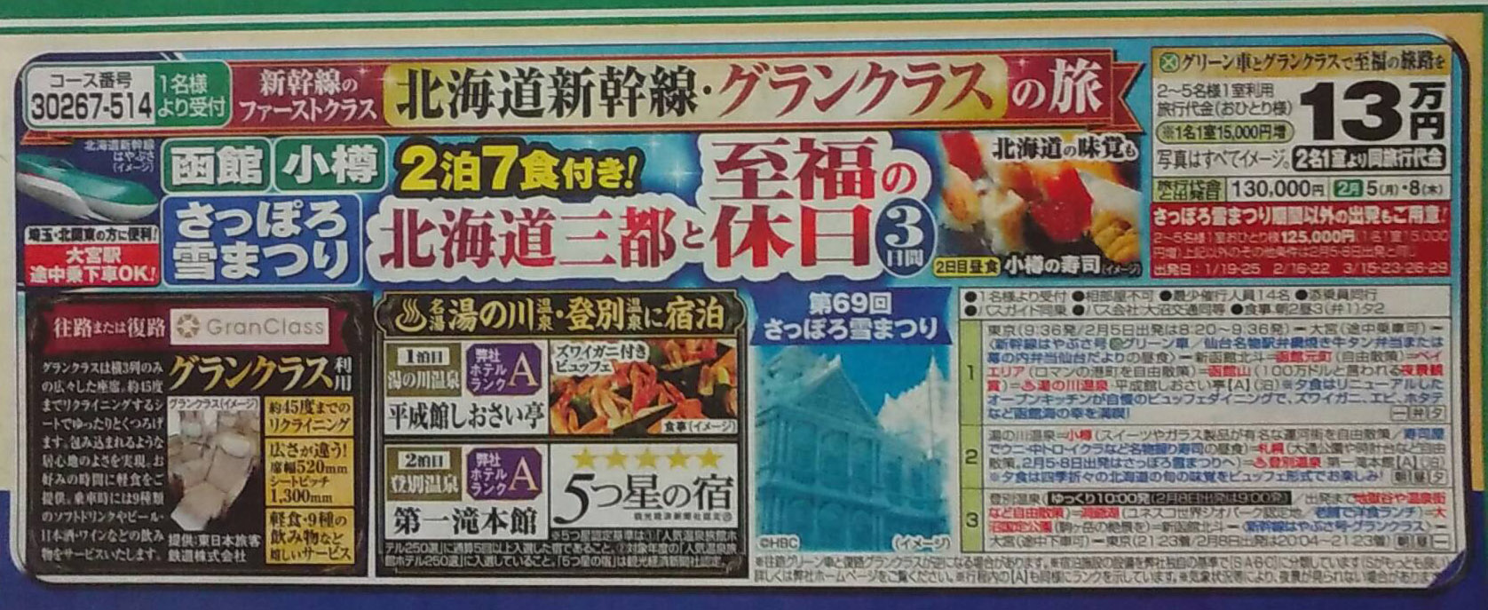 30267-514:『北海道新幹線・グランクラスとグリーン車利用 函館・小樽・札幌 湯の川・登別温泉 北の三都と至福の休日 3日間』<プレミアムステージ>コース情報:2泊で7食付き