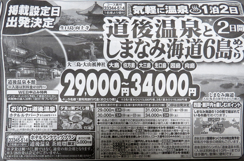 2日目 道後温泉(9:00出発予定)=<瀬戸内しまなみ海道>=②伯方島・船折瀬戸(潮流の眺め)=③三大島・大山神社(樹齢2,600年の大楠がご神木のパワースポット)=④生口島・瀬戸田(向上時の国宝・三重の塔/平山郁夫美術館は別料金800円*入場見学した場合、向上寺には行けません)=⑤困島・金蓮寺(村上水軍の菩提寺)=⑥向島・立花海岸=福山または岡山=<新幹線のぞみ号・禁煙席>=新横浜・品川=東京(21:26~22:33着)