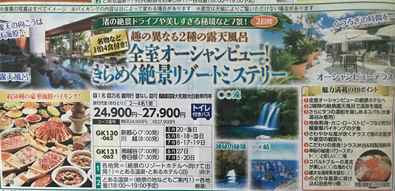 GK131:『名物4食付!絶景秘境7景!全室オーシャンビューリゾートミステリー2日間』<トイレ付きバス>【南越谷・春日部出発】