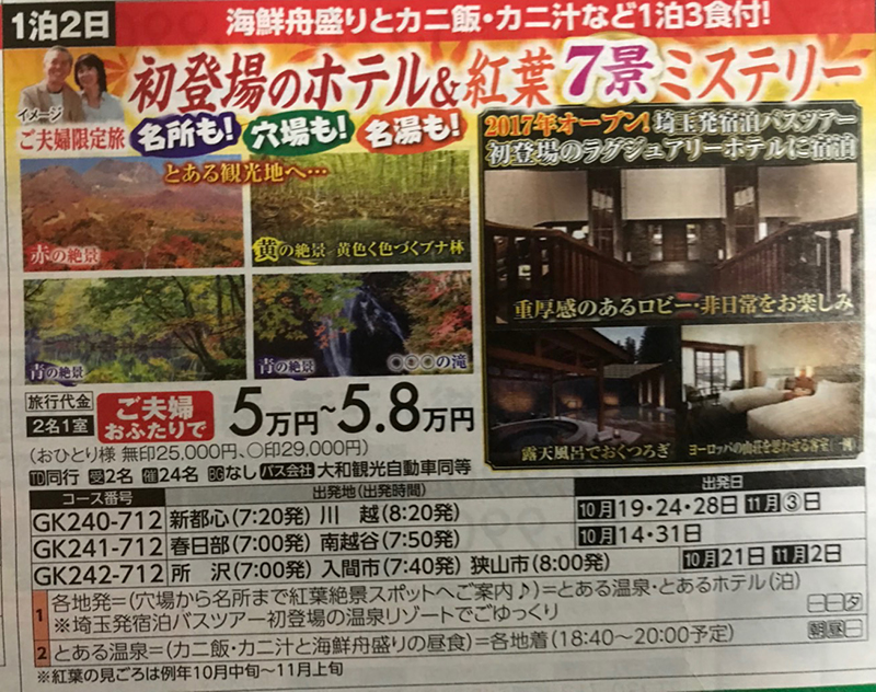 1日目 春日部(7:00発)=南越谷(7:50発)=(穴場から名所まで紅葉絶景スポットへご案内)=とある温泉・とあるホテル(泊) ※埼玉発宿泊バスツアー初登場の宿へご案内
