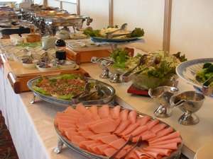 フグ付き会席の夕食(フグ刺しはおひとり様5枚)イメージ、朝食バイキングイメージ。