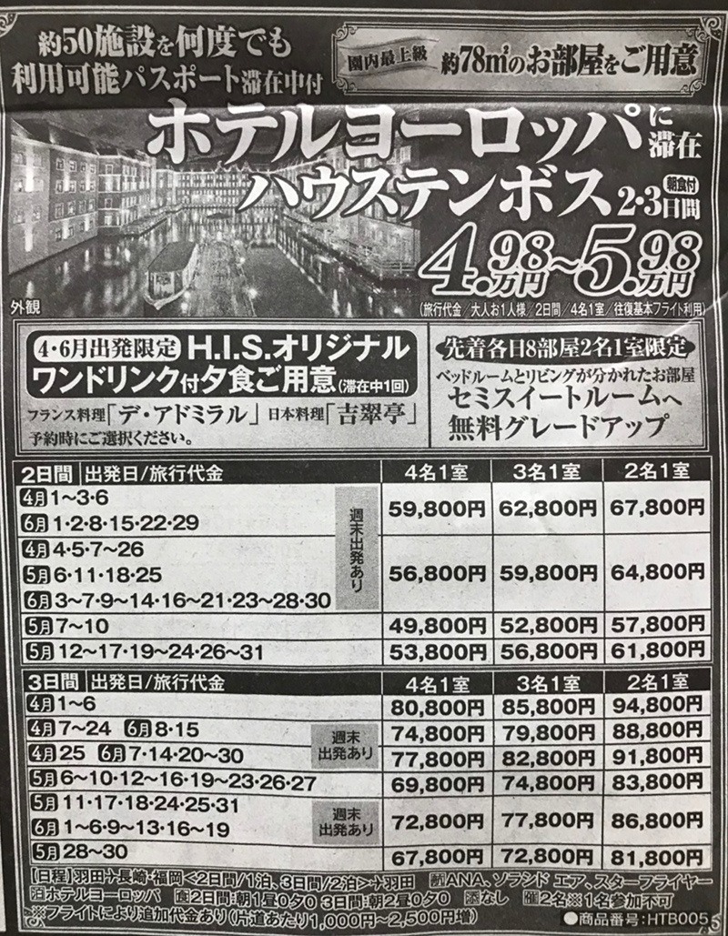 HTB005:【羽田発着】4・6月出発限定!「フレンチコース」または「日本料理」のホテルディナー1回付広々78平米のお部屋で、優雅に過ごす【園内最上級ホテル】ホテルヨーロッパに滞在 ハウステンボス2日間