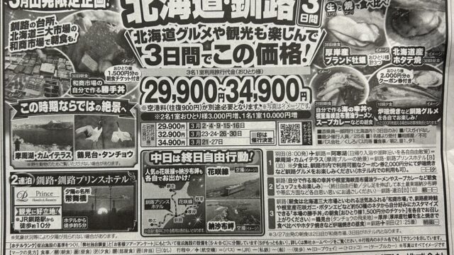 20000円台~ 『3月出発限定企画 往復JAL利用 厚岸産牡蠣にホタテ焼き!北海道グルメを満喫 北海道・釧路 3日間』<旅'smart> 2026年2月8日 keiko http://travel.shinoko.tokyo/wp-content/uploads/2019/12/logo01.png 新聞掲載された国内超お得旅行情報