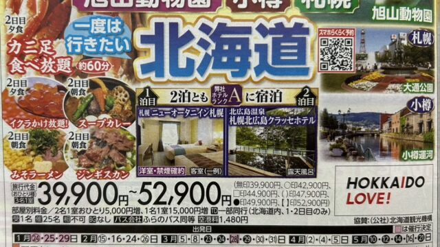 30000円台~ 『2泊とも弊社Aランクホテルに宿泊 旭山動物園・小樽・札幌とカニ足食べ放題の夕食(約60分) 一度は行きたい北海道 3日間』<旅’smart> 2026年1月10日 keiko http://travel.shinoko.tokyo/wp-content/uploads/2019/12/logo01.png 新聞掲載された国内超お得旅行情報