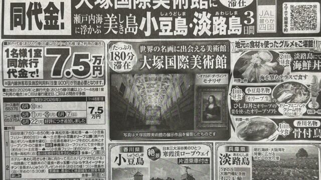 3日間 【1泊目:ザ・セレクトン高松】大塚国際美術館に180分滞在!瀬戸内海に浮かぶ美しき島 小豆島・淡路島 3日間 2026年3月25日 keiko http://travel.shinoko.tokyo/wp-content/uploads/2019/12/logo01.png 新聞掲載された国内超お得旅行情報