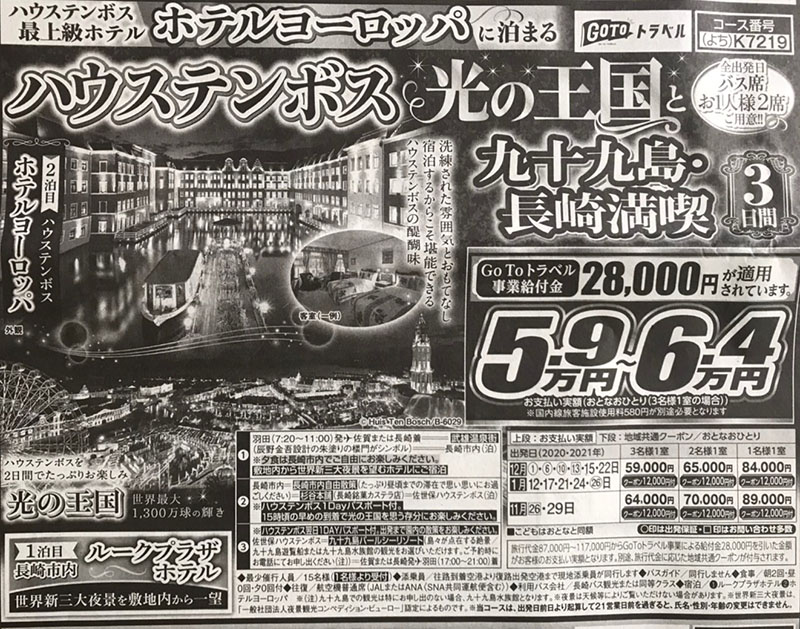 ハウステンボス光の王国と九十九島・長崎満喫 3日間