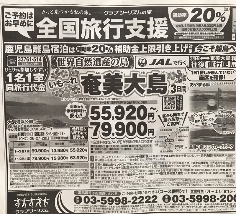 1名1室同旅行代金!「羽田⇔奄美大島」間は復直行便利用