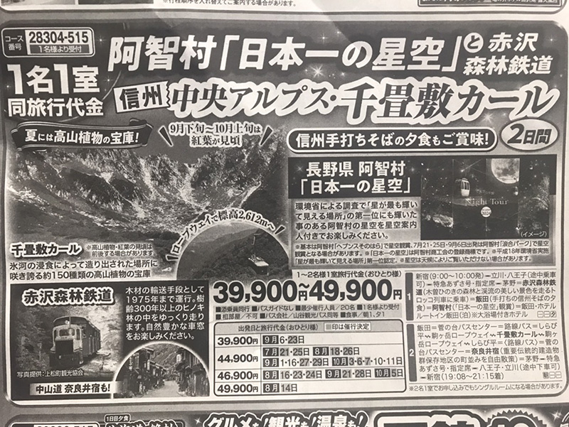 『<1名1室同旅行代金>阿智村「日本一の星空」と赤沢森林鉄道 千畳敷カール2日間