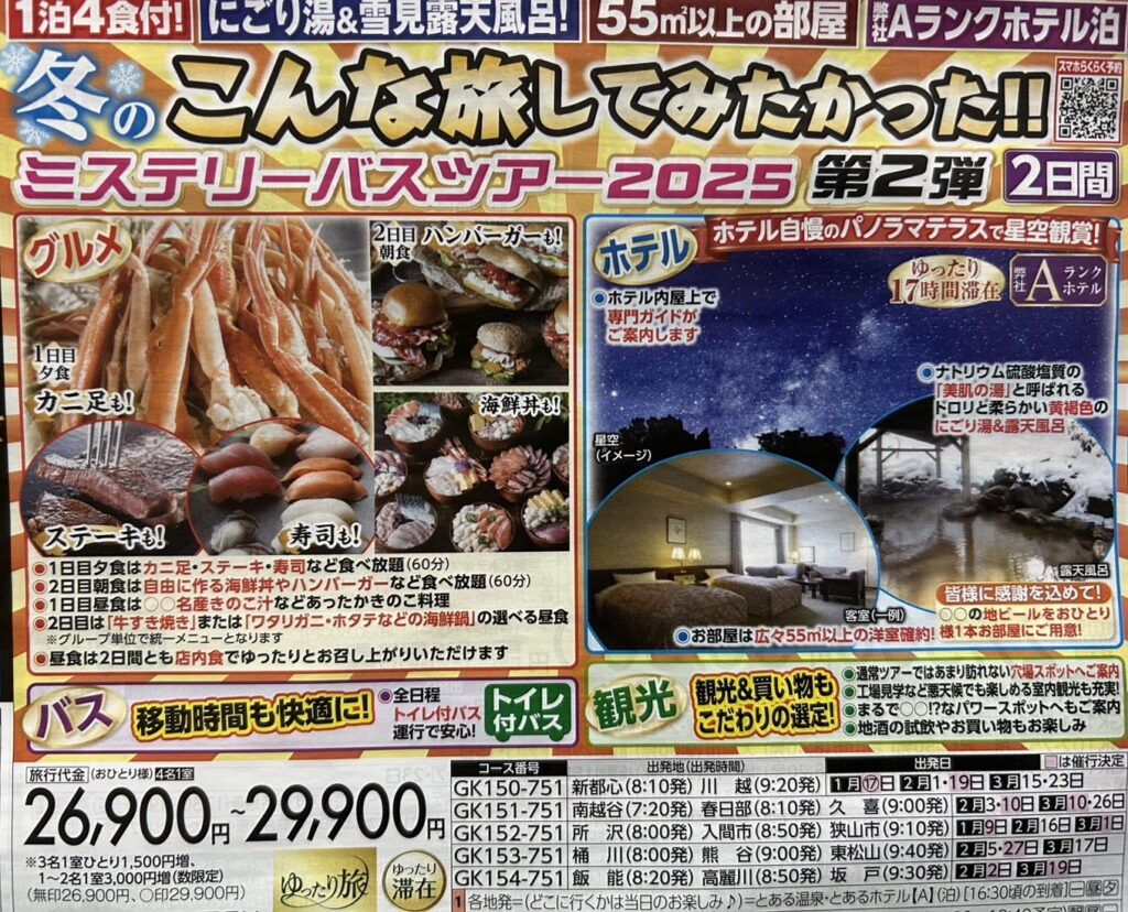 『1泊4食付き!弊社Aランクホテルに17時間滞在 冬のこんな旅してみたかったミステリー 2日間』【南越谷・春日部・久喜 出発】<ゆったり旅>