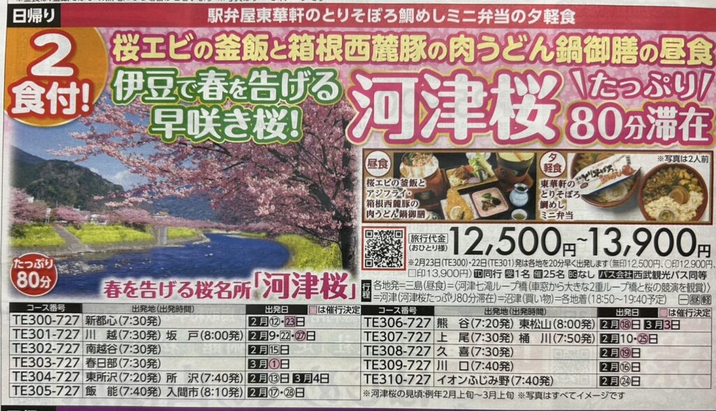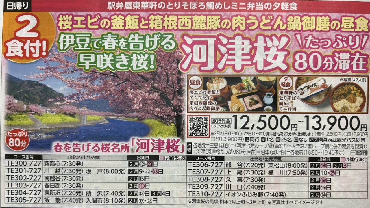 南越谷(7:30発)–三島[桜エビの釜飯と箱根西麓豚の肉うどん鍋御膳の昼食/50分]–<河津七滝ループ橋[車窓から大きな2重ループ橋と桜の競演を観賞]>–河津[春を告げる早咲き桜!河津桜たっぷり80分滞在]–沼津[買い物/25分]–南越谷(19:40予定)