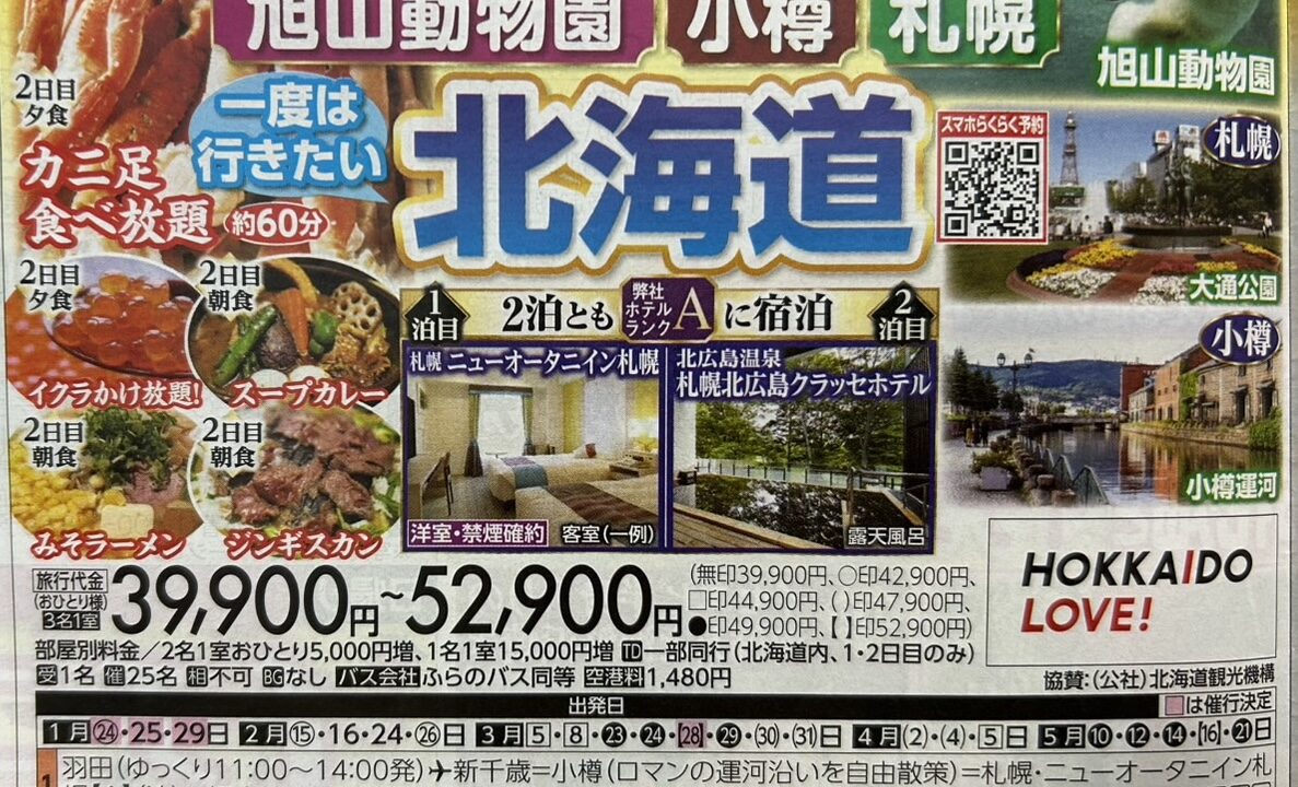 『2泊とも弊社Aランクホテルに宿泊 旭山動物園・小樽・札幌とカニ足食べ放題の夕食(約60分) 一度は行きたい北海道 3日間』<旅’smart>