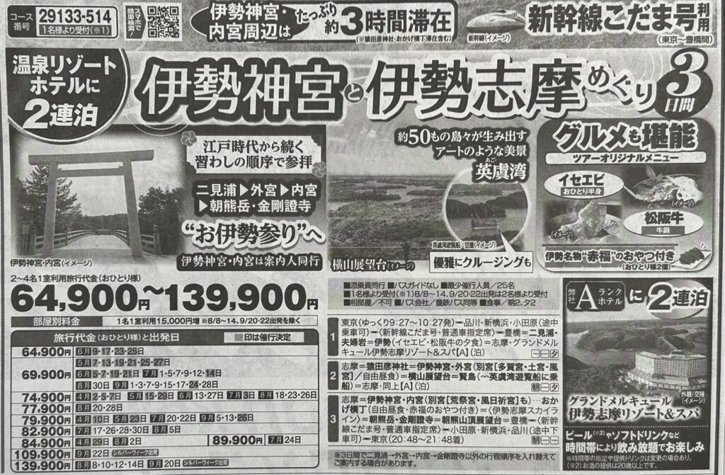 志摩–【移動:約50分】-伊勢神宮・内宮[15人につきひとり「お伊勢さん案内人」同行で参拝(別宮[荒祭宮・風日祈宮]–おかげ横丁[自由昼食/2日目猿田彦神社・内宮含め約3時間滞在/赤福のおやつ付き]–<伊勢志摩スカイライン>–【移動:約20分】-朝熊岳・金剛證寺[伊勢神宮の奥の院/30分]–【移動:約5分】-朝熊山頂展望台[標高555mの高台から伊勢湾を見下ろす/10分]–【移動:約20分】-伊勢・真珠店[養殖真珠発祥の地/20分]–【移動:約210分】-豊橋駅–新幹線こだま号・普通車指定席–小田原駅・新横浜駅・品川駅(途中下車可)–東京駅(20:48~21:48着)