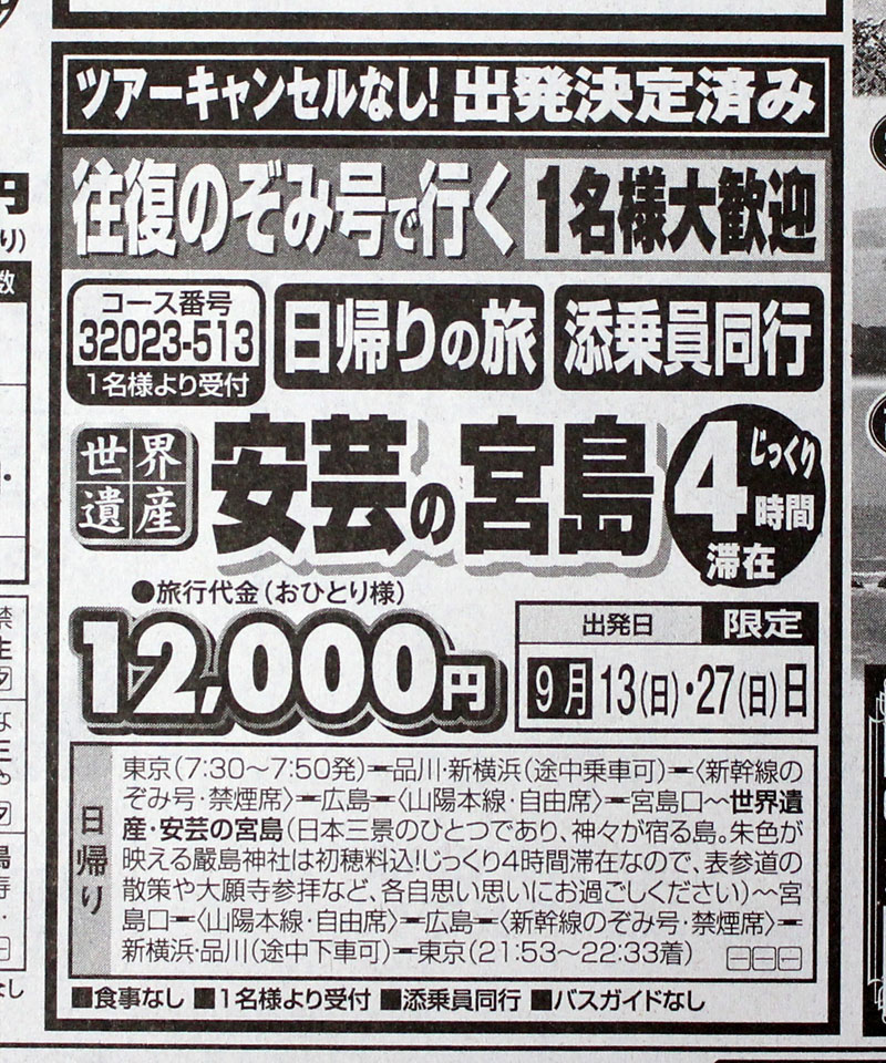 東京駅(7:30~7:50発)=<新幹線のぞみ号・禁煙席>=品川駅(途中乗車可)=新横浜駅(途中乗車可)=広島駅=<山陽本線・自由席>=宮島口~世界遺産・安芸の宮島<自由昼食含む>(日本三景のひとつであり、神々が宿る島朱色が映える嚴島神社は初穂料込!じっくり4時間滞在なので、表参道の散策や大願寺参拝など、各自思い思いにお過ごしください)=宮島口=広島駅=<新幹線のぞみ号・禁煙席>=新横浜駅(途中下車可)=品川駅(途中下車可)=東京駅(21:53~22:33着)