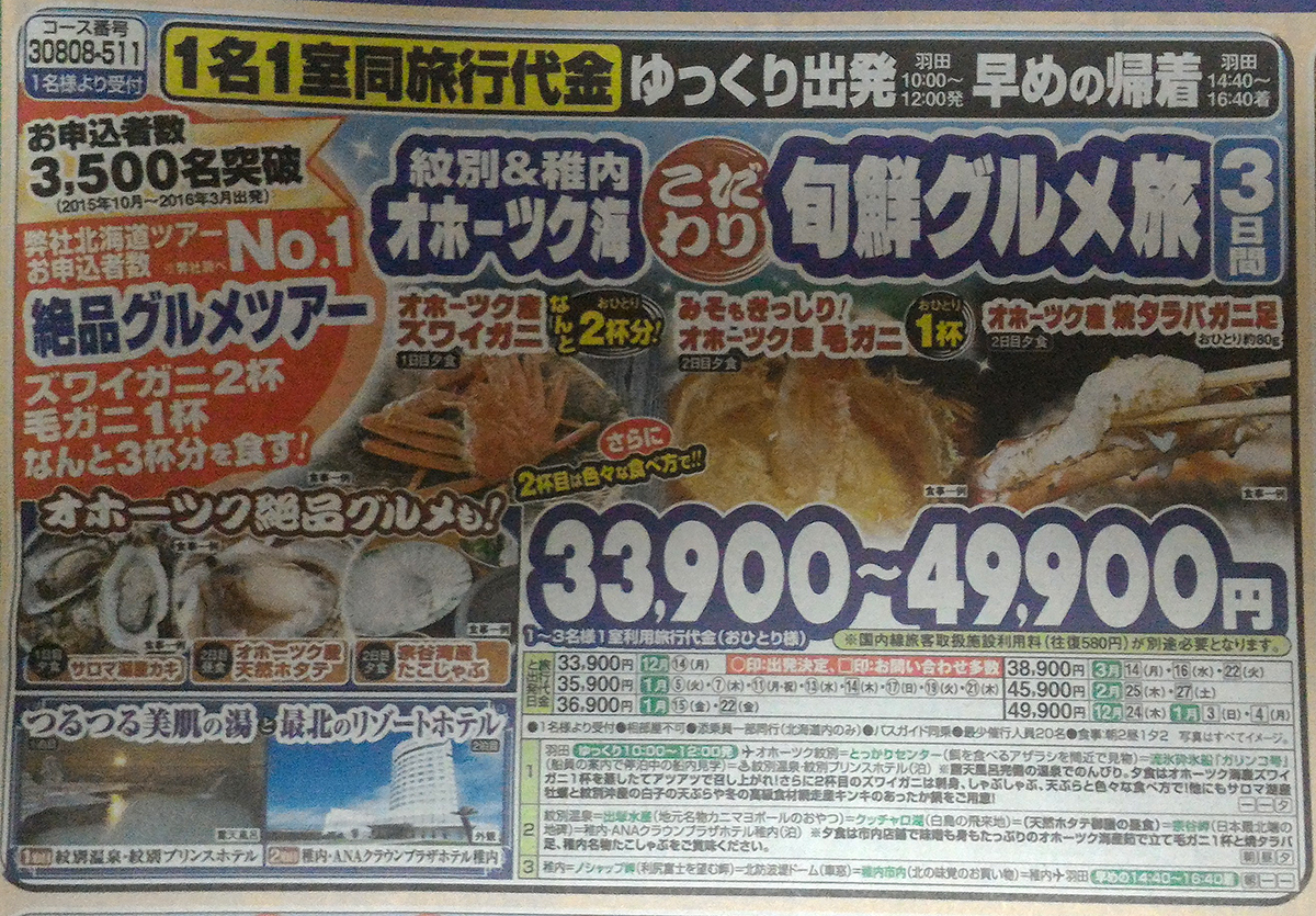 30808-511:『産地で食せば旨さが違う!紋別&稚内 オホーツク海こだわり旬鮮グルメ旅 3日間』 コース情報 1名1室同旅行代金
