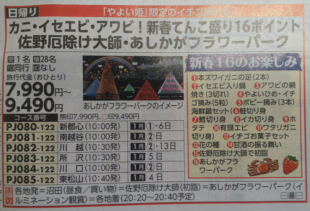PJ080-122:『カニ・イセエビ・アワビ!新春てんこ盛り16ポイント 佐野厄除け大師・あしかがフラワーパーク』【新都心 出発】