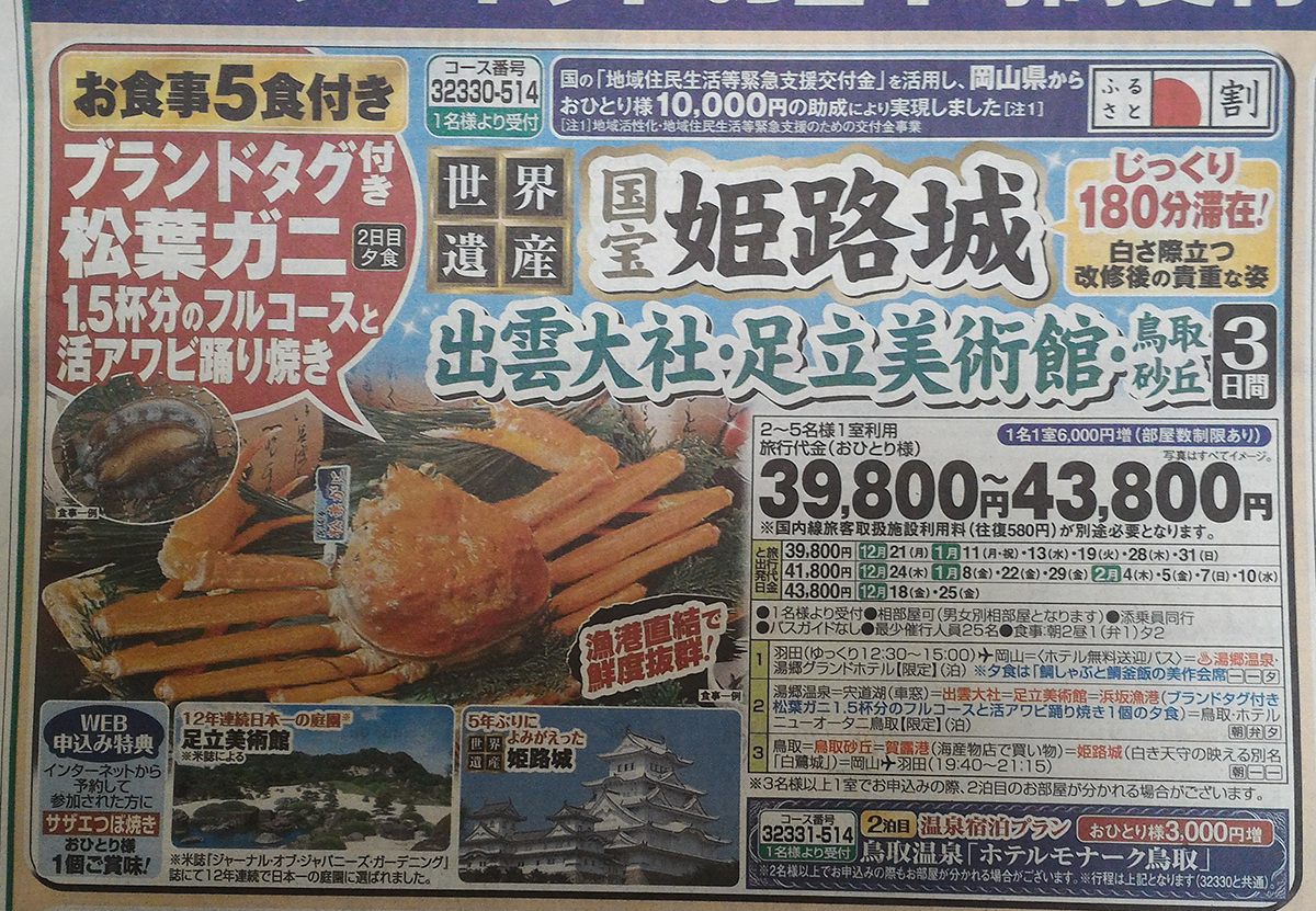 32330-514:『世界遺産・国宝 姫路城にじっくり180分滞在 出雲大社・足立美術館・鳥取砂丘 3日間』 コース情報 タグ付き松葉ガニフルコース WEB申込特典付