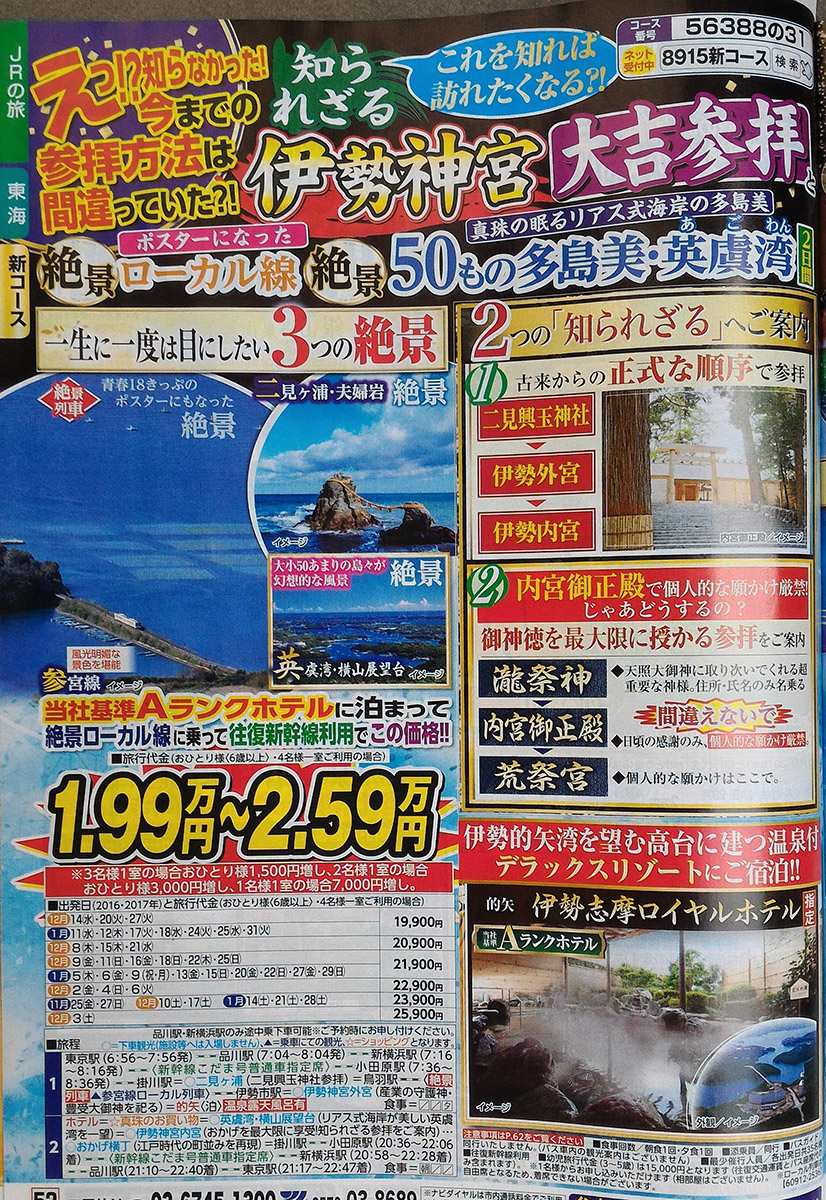 2日目 的矢(8:00頃発)=真珠のお買い物=英虞湾・横山展望台(リアス式海岸が美しい英虞湾を一望)【OP】英虞湾遊覧船/乗船約50分(別料金:1,300円)もご用意しております。=伊勢神宮・内宮(おかげを最大限に享受!知られざる参拝をご案内!)・・おかげ横丁(江戸時代の街並みを再現)=掛川駅=<新幹線こだま・普通車指定席>=小田原駅(20:36~22:06着)=新横浜駅(20:58~22:28着)=品川駅(21:10~22:40着)=東京駅(21:17~22:47着)