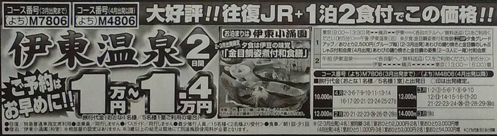 1日目 東京(9:00〜13:30)発=横浜=伊東=<各自ホテルへ/無料送迎バスをご利用ください(約5分)>=午後:伊東温泉(泊)