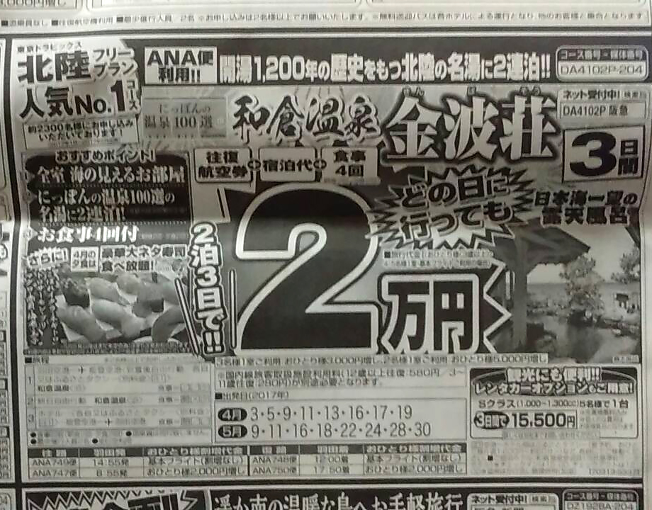 ・新聞掲載広告から厳選した格安ツアーです。三世代家族旅行などにおすすめです。