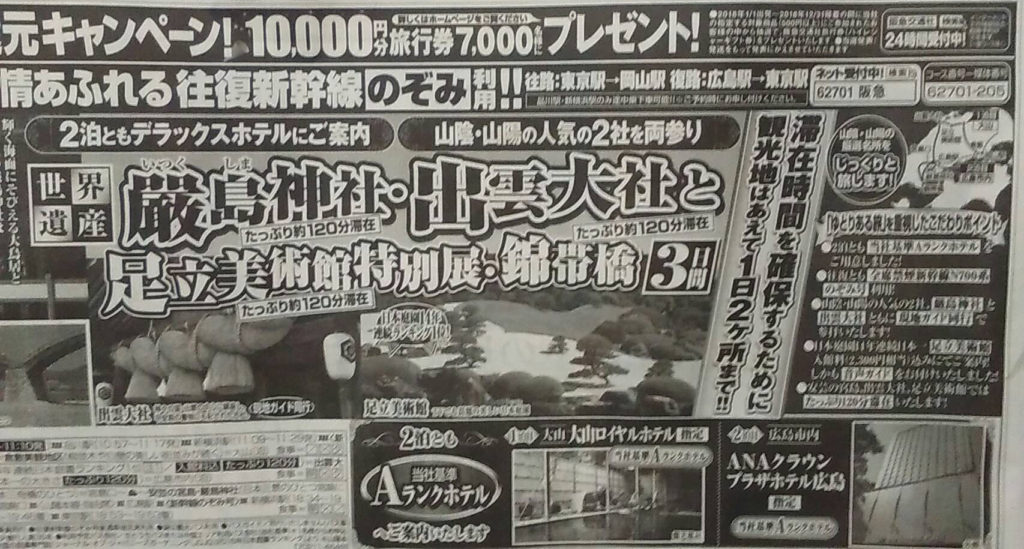1日目 東京駅(ゆっくり10:50~11:10発)=品川駅(10:57~11:17発)=新横浜駅(11:09~11:29発)=<全席禁煙・新幹線N700系のぞみ号・普通車指定席>=岡山駅=倉敷美観地区自由散策(柳並木や白壁の美しい街並みが続く文化の町)=大山<泊>■温泉露天風呂有り