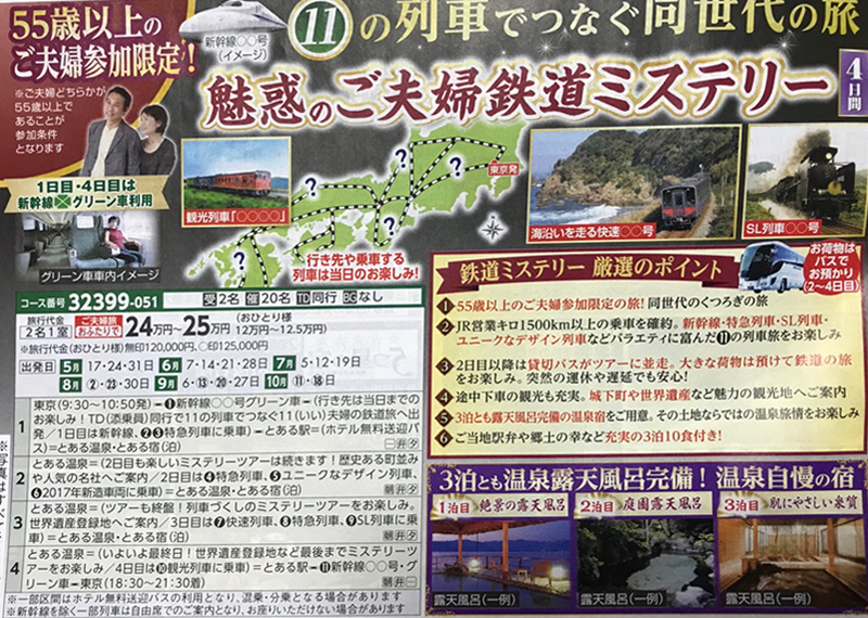 32399-059:55歳以上のご夫婦限定 11の列車でつなぐ同世代の旅 ご夫婦鉄道旅ミステリーツアー4日間
