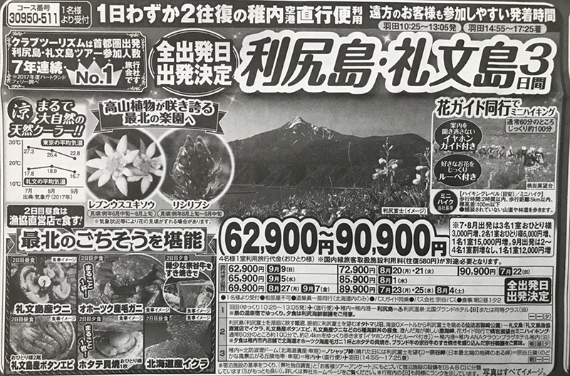 ・漁解禁!礼文島産春ウニや毛ガニを食べ!海鮮グルメにはたまりません!新聞掲載広告ならではの格安ツアー。