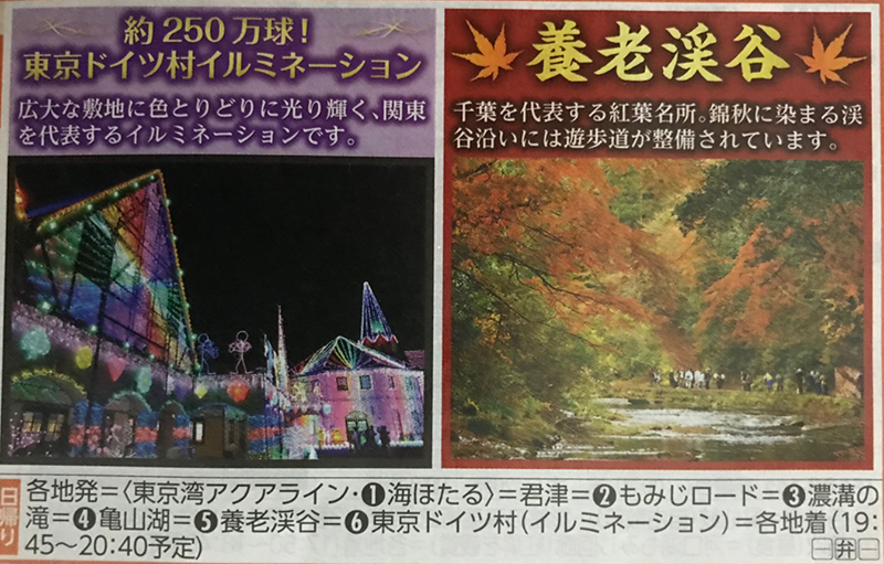 南越谷(8:50発)=南浦和(9:30発)=①海ほたるPA(休憩/20分)【10:50頃着=君津(買い物/20分)【11:30頃着】=②もみじロード(約10㎞にわたって広がるもみじ!紅葉観賞/20分)【12:30頃着】=③濃溝の滝(話題の絶景観賞/40分)【13:20頃着】=④亀山湖(ダム湖を彩る紅葉を見学/20分)【14:10頃着】=⑤養老渓谷(房総屈指の紅葉スポット「粟又の滝」の散策/55分)【14:50頃着】=⑥東京ドイツ村(昨年より50万球のパワーアップ!イルミネーション観賞/60分)【16:40頃着】=南浦和(19:50予定)=南越谷(20:30予定)